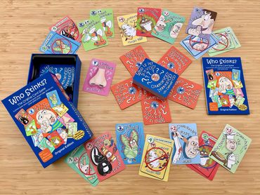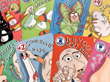 If your card pushes the stink level into the danger zone you must flip over one of the five stink pile cards which are placed face-down in a fan-like pattern under the draw pile to see if you are the Stinker, or prove everyone wrong: